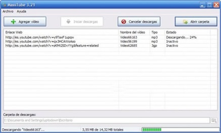 El MassTube es una aplicación hecha para poder descargar videos de Youtube. Las características más notables son la posibilidad de bajar más de un video a la vez y también permite elegir el formato del video (mp4, 3gp, flv, mp3, mpg, mpeg, ogg, swf). El MassTube es totalmente gratuito y está disponible en español. Este descargador de videos pesa 3.14MB.